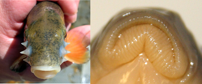 | Three large tubercles on snout of breeding male (left, photo by Todd Crail); Ventral view of mouth of Eastern Creek Chubsucker showing plicate lips, which meet at nearly right angles (right). |